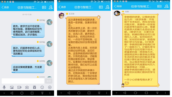 其次,在课程过程中在学院QQ群中积极引导思考,进行分享体会核心的,使讲座真正落实到实际的教学科研工作中,提升了广大教师的学习热情,凝练了相互学习,相互分享,共同进步的学术氛围。