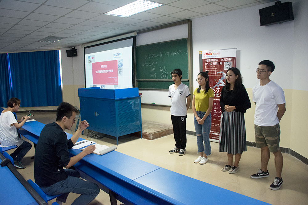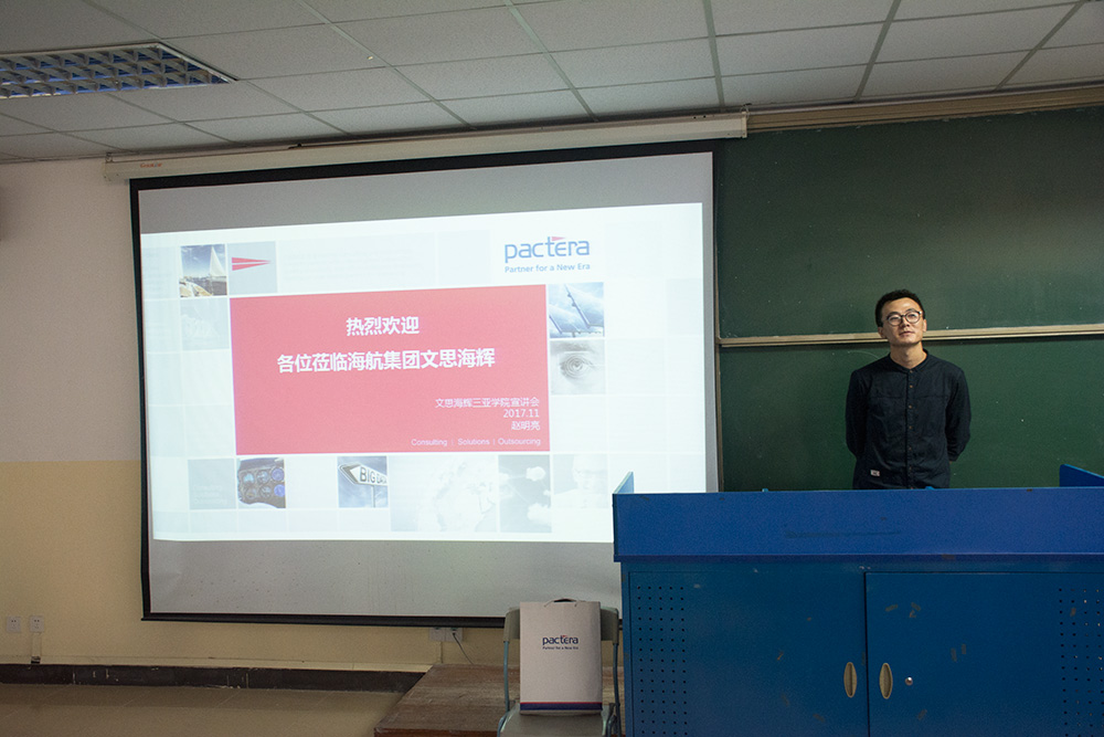 会议开始,赵先生介绍了文思海辉是一家全球性的IT服务企业,共有26000名专业人士,与全球各个IT公司都有着密切的合作关系,并且隶属于海航集团,可以体现出文思海辉公司是非常有实力的。随后赵先生又详细介绍了招聘的信息以及要求,其主题主要围绕人才的能力,他多次强调了“将人才留在海南”这一核心内容。赵先生也叙述了IT行业人才供需不成比例,供小于需的现状,这对于我院学生是一个良好的契机 。