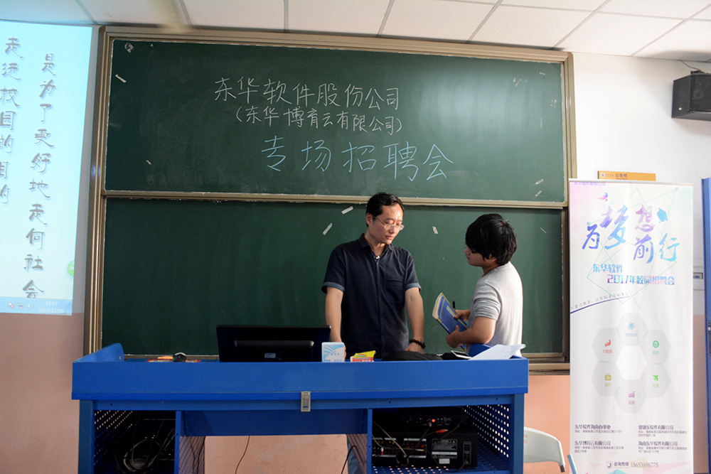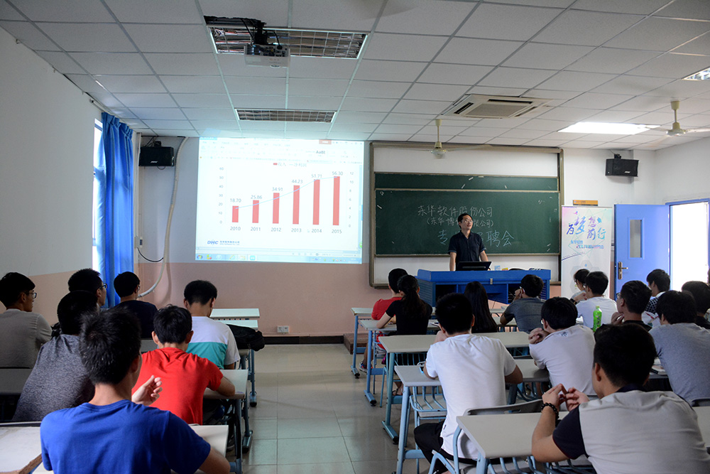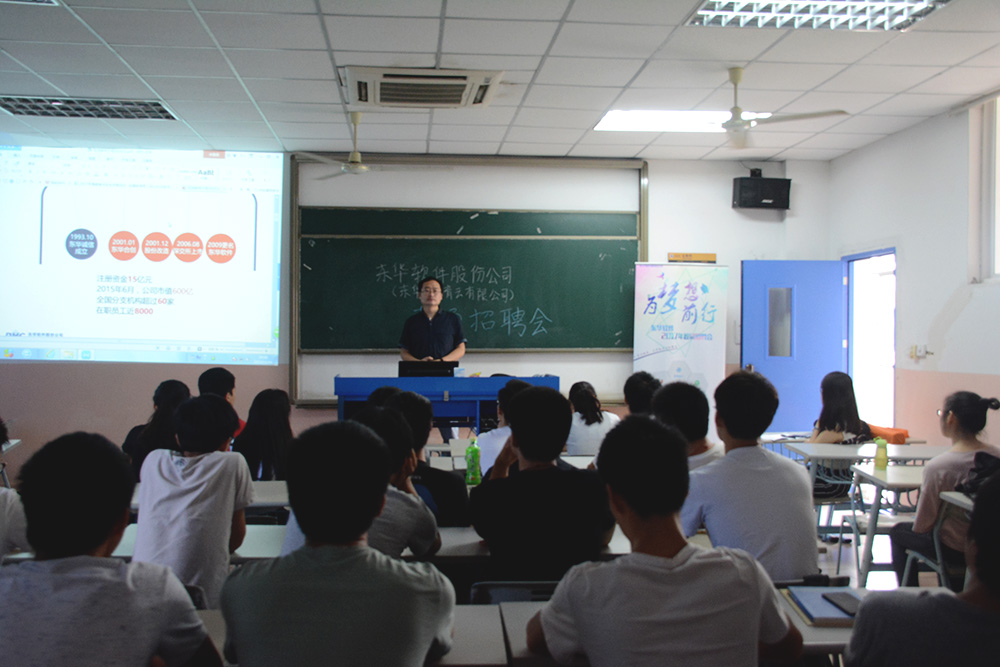 2017年11月16日上午10点整,由东华博育云有限公司张金涛先生主讲的专场招聘会在书新四号楼305教室举办,参加本次招聘会的有东华软件工程师胡庚丽,我院思想导师彭婷以及我院各年级同学。