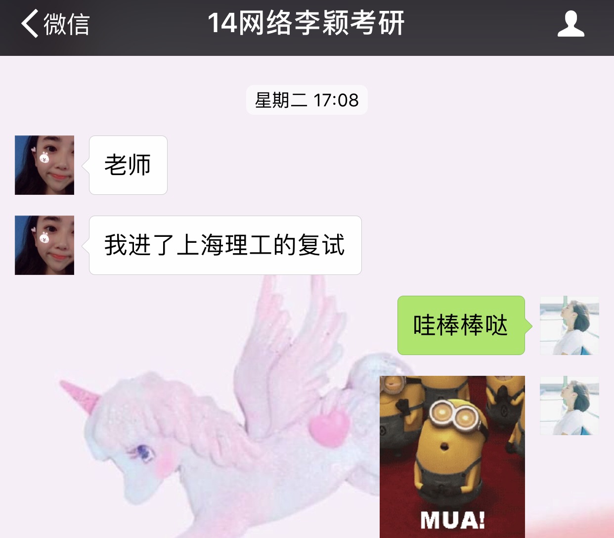 3月20日下午李颖同学兴奋地给思想导师彭婷发了一条微信,说她过了上海理工大学的初试,进入复试环节了。彭老师立即把这个消息告诉我院领导,引起我院领导的高度重视,我院刘开南院长当即通过电话指导,向李颖同学传授了复试的一些技巧和注意事项。