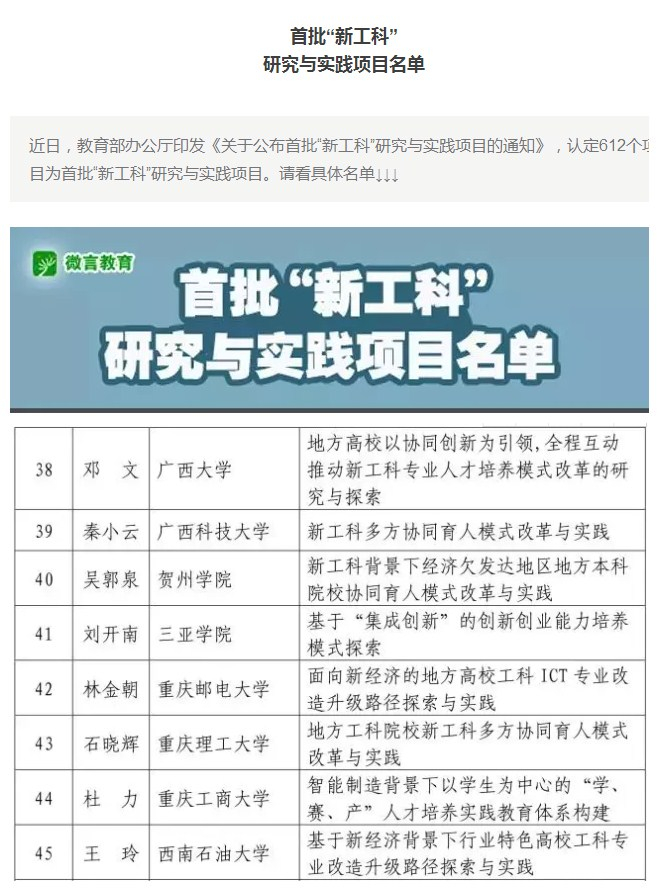 近日,教育部办公厅印发《关于公布首批“新工科”研究与实践项目的通知》,教育部网站公布了认定的首批612个“新工科”研究与实践项目名单。我院教师项目“基于‘集成创新’的创新创业能力培养模式探索”获批教育部首批“新工科”研究与实践项目---地方高校“新工科”综合改革类项目立项。