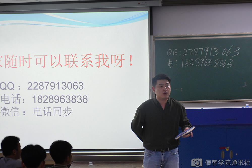 紧接着韩钰定和张宏老师写下自己的联系方式,方便能够随时解决同学们学习和生活中遇到的困难。同时介绍了学校、学院、专业、生活服务、志愿者服务以及学生组织。