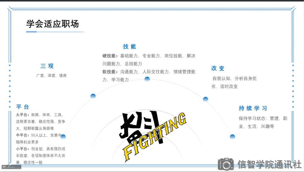 此次分享会,弥补了信智学院的毕业生们对就业信息的缺陷,加强了信智学子对就业的理解和认知,希望他们能找到自己心仪的工作,走向成功之路。