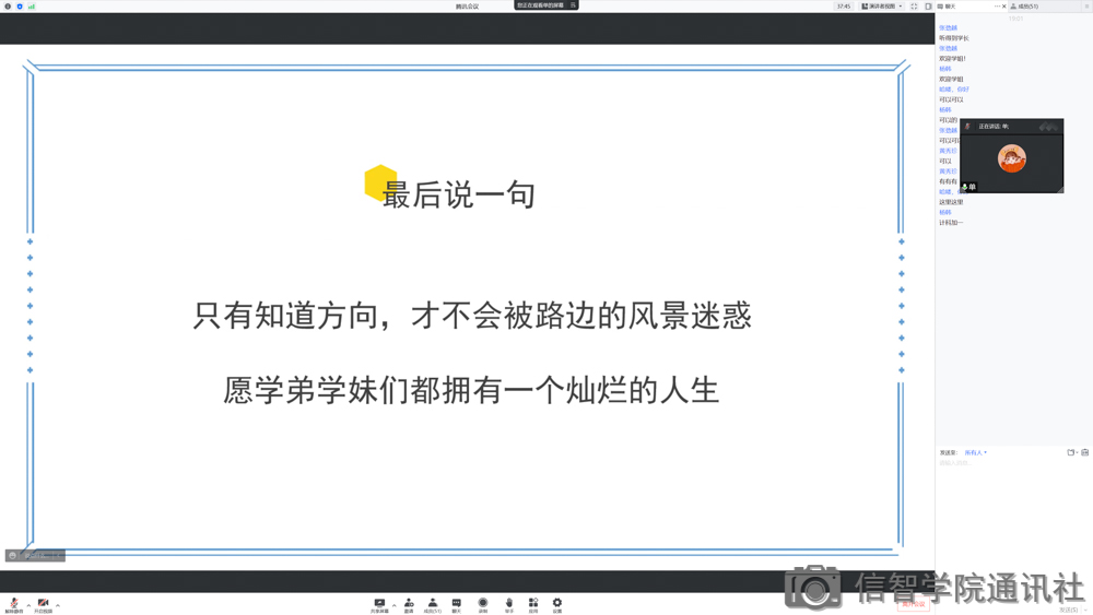 在会上,单田甜学姐与张婧祎学姐为大家讲解了如何在毕业后的就业环境中做好规划,并分析了相关专业的就业市场及就业前景,她们从多个方面对信智学子们的就业优势进行了分析,增强了信智学子们的就业自信。