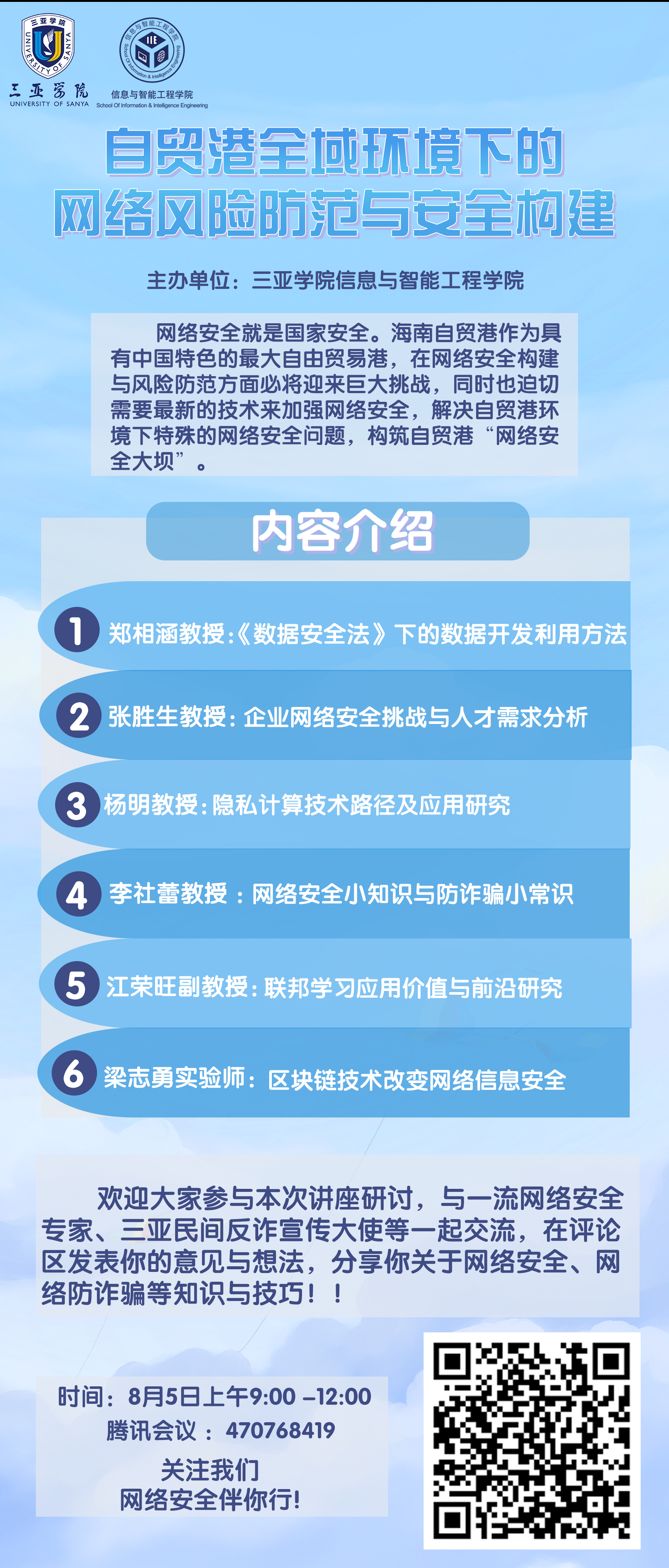 2022年8月5日上午,三亚学院信息与智能工程学院联合容淳铭院士工作站、陈国良院士团队创新中心等学术机构,成功举办“自贸港全域环境下的网络风险防范与安全构建”暑期学术沙龙,该活动是三亚学院信智学院暑期系列学术沙龙活动之一。本次会议采用腾讯会议方式通过线上举行,同时通过B站进行现场直播。