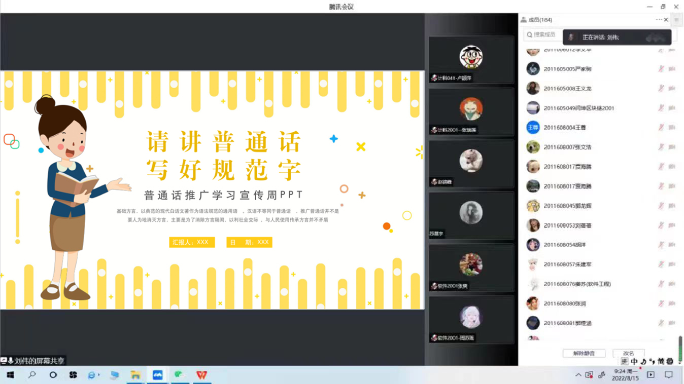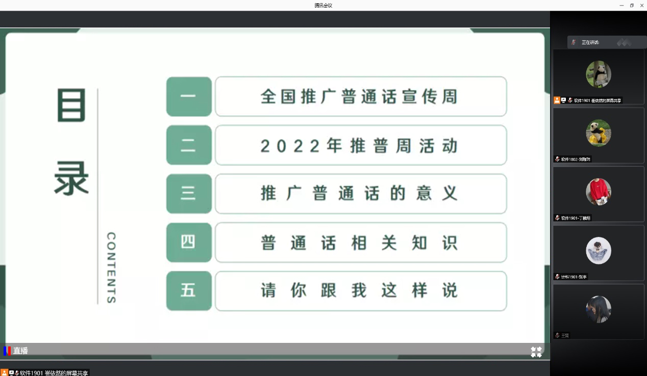 普通话是国家通用语言,规范使用普通话是城市文明的重要体现,为增强信息与智能工程学院全体师生的语言规范和推普参与意识,促进推广普通话和语言文字规范化工作不断在信智学院深入开展,信智学院各班级于2022年9月12日在线上开展了以“推广普通话,喜迎二十大”为主题的主题班会。