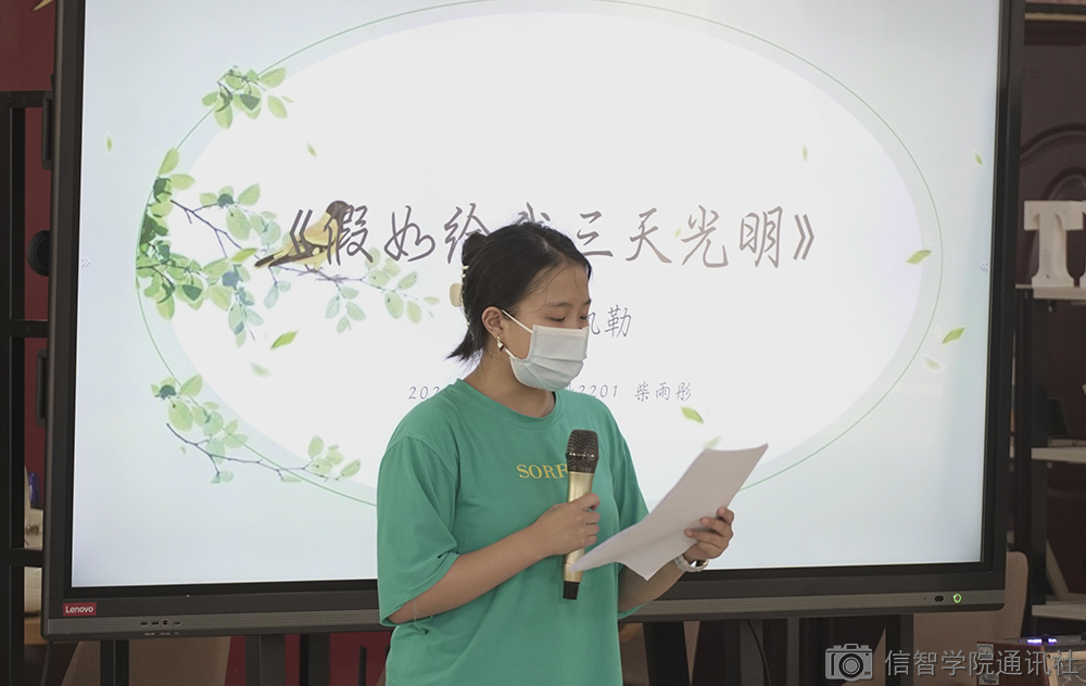 会议伊始,于海娇老师先列举外国作家海伦凯勒的经历,再列举民国时期林徽因和陆小曼的人生经历和个人成就,旨在表明外在金钱投入对教育的影响深远书是最好的老师,读书是精神上的释放窗口,可以屏蔽外界的声音。紧接着于海娇老师邀请了两位同学来分享他们喜欢的一本书,张雨彤同学分享了《假如给我三天光明》,她告诉大家无论何时都要坚定心中的信念,热爱生活。李颖同学则是就《平凡的世界》一书与大家分享了感悟:平凡的世界并不是惊涛骇浪的传奇,而是平凡而宁静的真实生活,我们要赞生活之艰辛,刻时代之风貌,以无畏的心去面对生活的困苦。两位同学精彩的发言体现出他们研读这两部作品之深,随后老师和同学们一起互动,讨论书本内容。分享会最后,老师向同学们推荐了几本书籍,号召同学们在书籍中找到灵魂的碰撞。