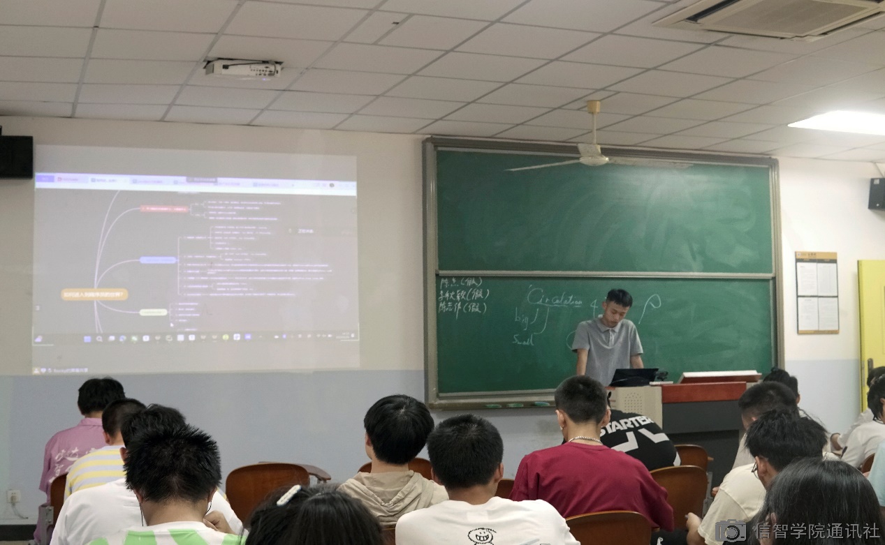 活动伊始,由牧马南山第五任负责人徐金辉学长向同学们提出了你是否适合学编程、学编程可以带来什么、为什么想学编程三个问题为同学们引出了学习编程的重要性,然后介绍了多种学好编程的方法,之后为同学们介绍了一些编程比赛并鼓励大一同学们积极参与各项比赛,最后由智能科学与技术2201班徐峥同学上台与同学们分享了自己的学习进度和学习成果,并讲述了自我计划性学习的重要性。