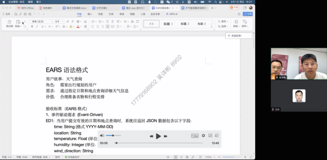 在EARS语法格式和GHERKIN语法格式的研究中,吴祥彬老师充分发挥了其专业优势,深入探讨了这两种语法在需求描述中的独特应用。他通过精心设计的3—5个不同场景下的实际案例,详细对比了使用EARS语法和不使用EARS语法对需求描述的效果差异。这种对比分析不仅揭示了EARS语法在需求描述中的独特价值,也为后续的需求分析和文档生成工作提供了宝贵的实践经验。