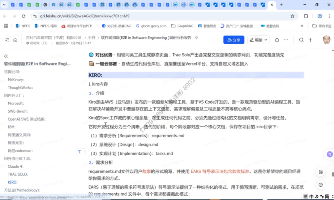 此外,吴祥彬老师还对kiro框架的工作流进行了深入剖析,编写了详尽的KIRO文档说明。他巧妙地利用KIRO作为开发工具,重点开展了需求生成效果比对和PRD文档/设计文档生成等工作。通过实际操作和验证,他充分展示了KIRO框架在提高开发效率和文档质量方面的显著优势,为吉利汽车研究院的软件开发工作注入了新的活力。