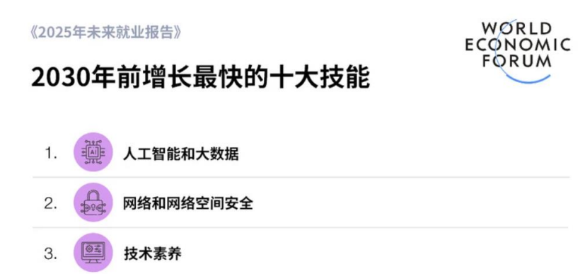 世界经济论坛《2025年未来就业报告》指出:预计到2030年全球将新增7800万个就业岗位,劳动力亟需技能升级以应对变革,其中人工智能与大数据领域成为增长最为迅速的核心技能方向。