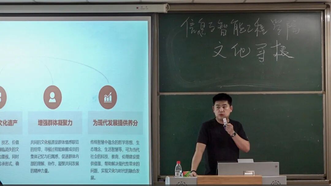 信息与智能工程学院为帮助2025级新生在数智化时代筑牢文化根基,建立清晰的自我认知与文化认知,为本科阶段的自主学习培育奠定基础,于2025年9月中下在书新五号楼举办“文化寻根”教育活动。课程由思想导师韩钰定、张天锡老师主讲,所有2025级新生参与。
