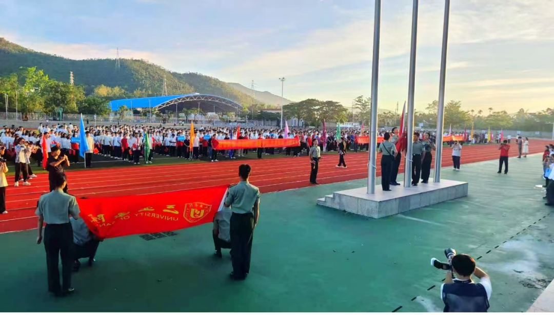 在“喜迎华诞・盛世华章”主题升国旗活动中,学院师生与全校各院系成员齐聚现场。清晨时分,全体师生身着整齐服装,注视国旗护卫队迈着铿锵步伐走向旗杆。这场升旗仪式不仅是对祖国母亲的深情告白,更成为一堂浸润心灵的爱国主义教育实践课,既是一次精神洗礼,也是学院落实爱国主义教育的生动实践。