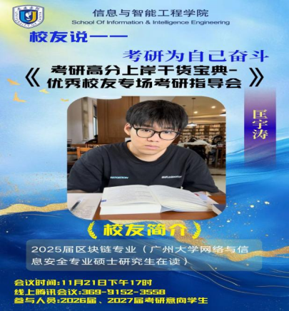 为助力学子锚定考研方向、掌握高效备考策略,信息与智能工程学院“校友说”系列分享活动持续赋能,聚焦考研赛道推出专场指导。11月21日下午17时,学院邀请2025届软件工程(区块链)专业校友匡宇涛,线上开展《考研为自己奋斗——考研高分上岸干货宝典-优秀校友专场考研指导会》,作为学风建设月特色系列活动之一,本次活动旨在为2026届、2027届考研意向学生打造一场干货爆棚的备考指导盛宴。