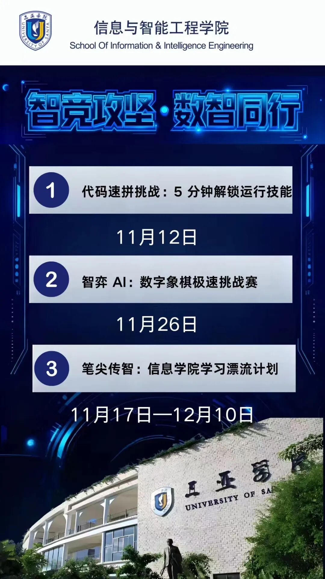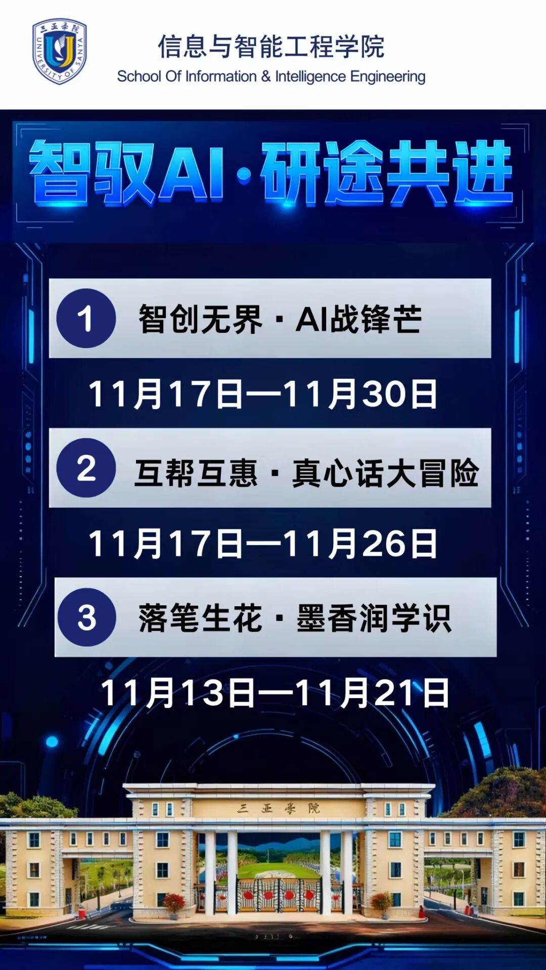 信息与智能工程学院活动以学院办学结构性调整改革理念为核心,通过三大模块系列活动构建“自主学习+互助提升”的学风生态:专业实践层面,依托AI+技能展示、代码速拼等专业活动,推动学生践行跨界融合、效果导向思维,深度衔接“数字智能”学科平台建设;成长规划层面,借助学习计划制定、学业生涯规划大赛等载体,引导学生从“被动学习”转向“主动共建者”角色,扎实落地“定制化学习”育人模式;在互助共享层面,以经验交流、学习漂流等形式搭建资源共享桥梁,全方位构建优良学风生态,为培养产业适配型人才筑牢基础。