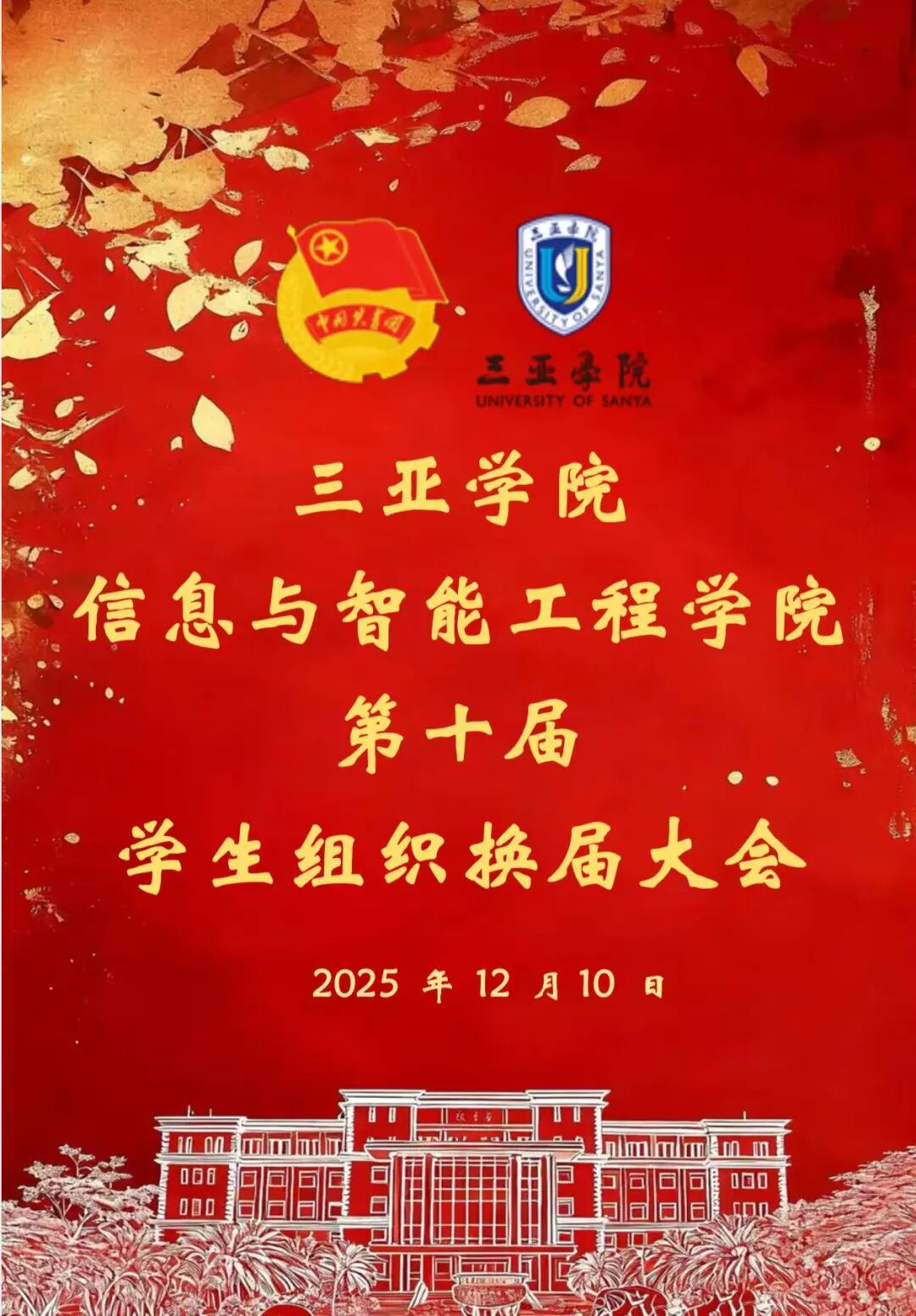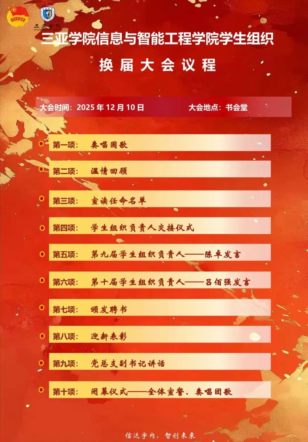 为传承学生组织服务精神,凝聚青年奋进力量,为学院学生工作注入新鲜血液,三亚学院信息与智能工程学院第十届学生组织换届大会预计将于12月10日在书会堂隆重举行。本次大会将见证责任的交接、梦想的延续,既是对过往工作的总结致敬,更是对未来征程的扬帆起航,诚邀全院师生共同见证这一庄重时刻。