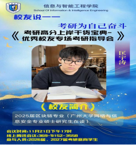 “校友说”考研指导会,为考研学子点亮了前行的灯塔。学院邀请 2025届软件工程(区块链)专业校友匡宇涛,线上开展《考研为自己奋斗——考研高分上岸干货宝典 -优秀校友专场考研指导会》。匡宇涛校友凭借自身完备且成功的考研备考经历,从量身定制备考规划、系统梳理核心学科知识点、拆解考研题型答题密钥,到科学调适备考与应试心态等多个维度,为学弟学妹们条分缕析地拆解考研备考的重点与难点。同时,他以自身升学经历为蓝本,分享院校抉择、专业匹配及复习节奏把控等实战经验,让学子们拨云见日,明晰考研征途的前行方向。互动问答环节更是精准回应了学子们在考研备考中的具体疑问,实现了“靶向提问,高效解惑“。