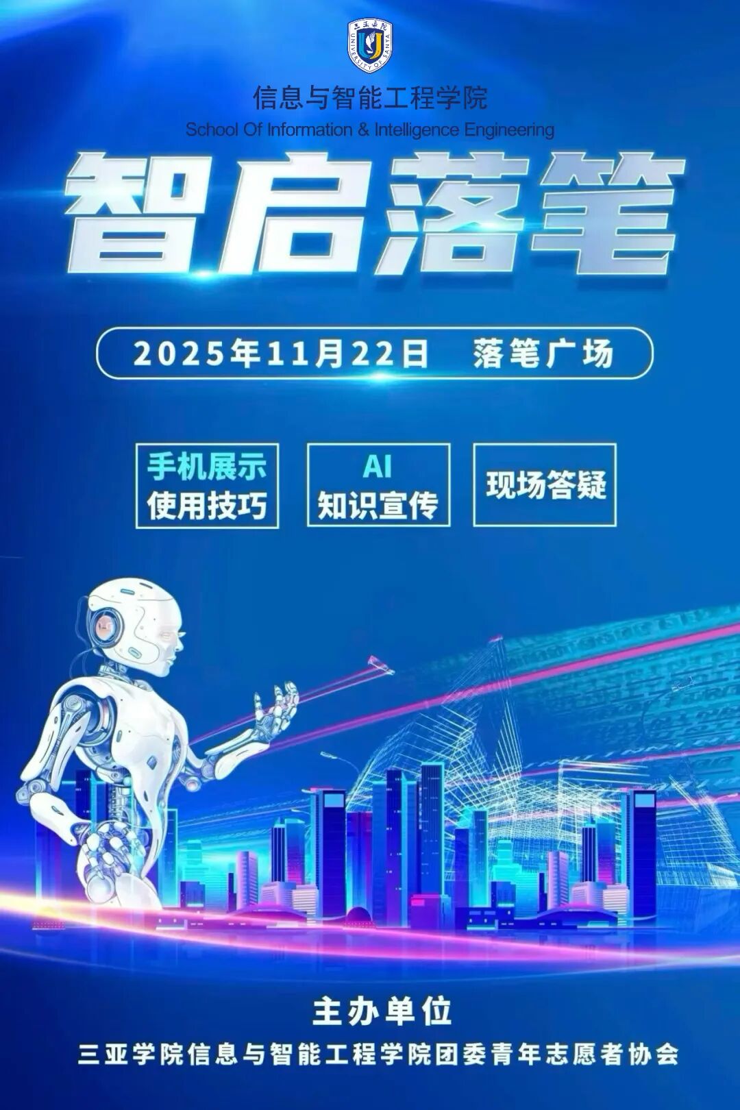 信息与智能工程学院共青团委员会开展的“智启落笔”活动,将于2025年11月22日在落笔村广场开启,一起探索AI的奥秘!我们将演示手机使用技巧,宣传AI知识,并解答现场疑问。本次活动由三亚学院信息与智能工程学院团委青年志愿者协会主办,适合所有对科技充满好奇的社区居民和同学们。快让我们一起参与这场智慧的盛会!