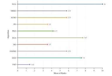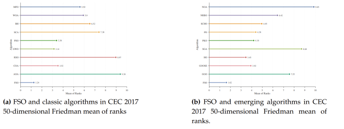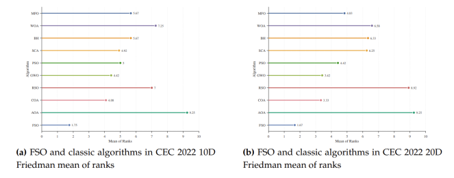 本研究对水螺优化器(FSO)进行了系统的性能评估。测试采用CEC 2017(50维)及CEC 2022(10维与20维)基准函数集,并将FSO与9种经典算法及9种近年来发表的新算法进行了对比。结果表明,FSO在多项测试中均表现出优良性能。基于弗里德曼检验的平均排名结果如图5至图7所示。