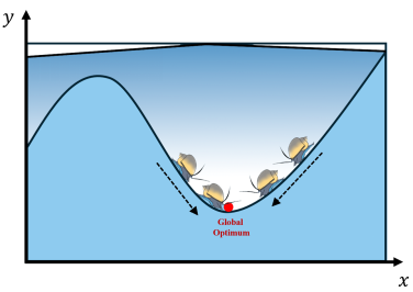 上浮:水螺能够通过调节体内气室(类似肺囊)中的气体含量来改变自身比重,从而实现上浮并随水流漂移。这种漂流行为显著扩大了其活动范围,对应算法中的全局探索机制,如图2所示;