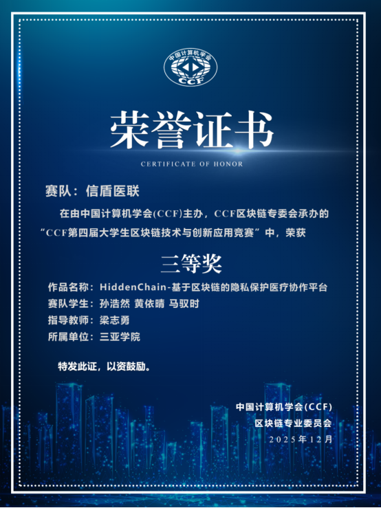 2025年12月19日,由中国计算机学会(CCF)主办的第四届大学生区块链技术与创新应用竞赛全国总决赛在上海落下帷幕。三亚学院信息与智能工程学院软件工程(区块链)专业2022级学生孙浩然代表“信盾医联”团队凭借作品《HiddenChain:基于区块链的隐私保护医疗AI协作平台》,从全国众多顶尖高校团队中脱颖而出,荣获全国三等奖。