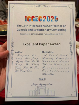 2025年12月17日至19日,信息与智能工程学院电子信息专业2024级硕士研究生刘高源同学前往福建参加第十七届国际遗传与进化计算会议(The 17th International Conference Genetic and Evolutionary Computing, ICEGC 2025)。本次会议由阳光学院、南阳理工学院联合主办,阳光学院元宇宙与新媒体学院、福建省高校工业互联网智能控制技术与系统工程研究中心、阳光学院科技处及南阳理工学院计算机与软件学院共同承办。