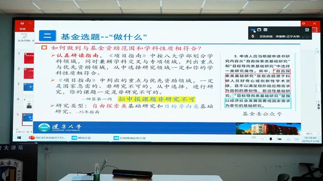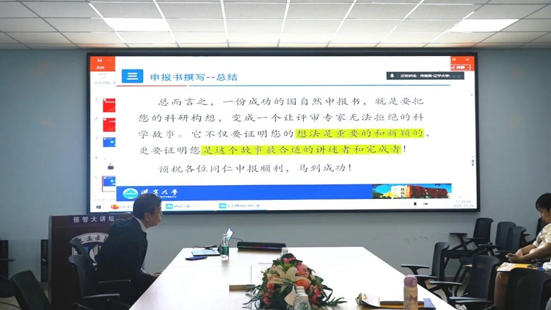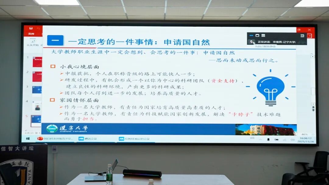 2025年11月26日16:30,在信息与智能工程学院会议室辽宁大学浙北城市人工智能研究院院长、博士生导师宋宝燕院长应邀分享了国家自然科学基金申报经验。她从选题策略、申报书撰写到团队支撑等多个维度,为科研人员提供了系统性的指导。
