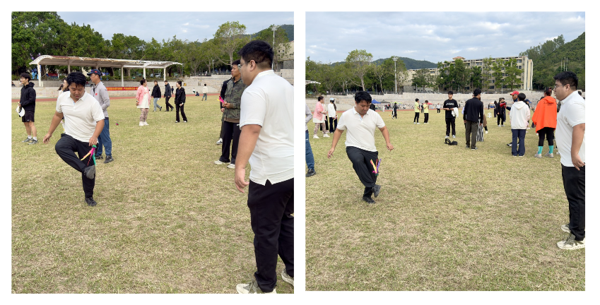 乙组项目主打趣味休闲,传递运动快乐。足球九宫格前,选手们瞄准目标精准射门,每一次命中都引来欢呼阵阵;气球运纸杯项目里,队员们小心翼翼地传递气球,失误时的笑声与成功后的喝彩交织成欢快的旋律;踢毽子、企鹅漫步等项目更是将欢乐氛围拉满,选手们灵活颠毽、模仿企鹅憨态前行,在轻松愉悦的氛围中感受运动的独特魅力。