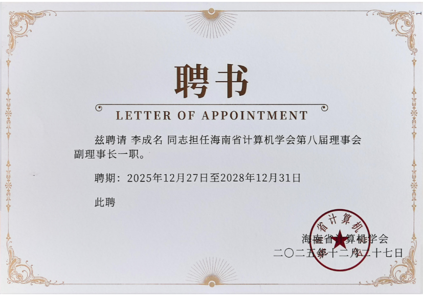 在年度工作总结环节,海南省计算机学会理事长邱钊汇报了学会2025年的工作成果与未来展望,并在学会理事会上宣布了一项重要决定:三亚学院增补为海南省计算机学会副理事长单位,我校副校长李成名教授增补为学会副理事长。这一举措进一步壮大了学会的组织力量,也体现了三亚学院在计算机与人工智能领域的学术影响力与实践贡献获得高度认可。