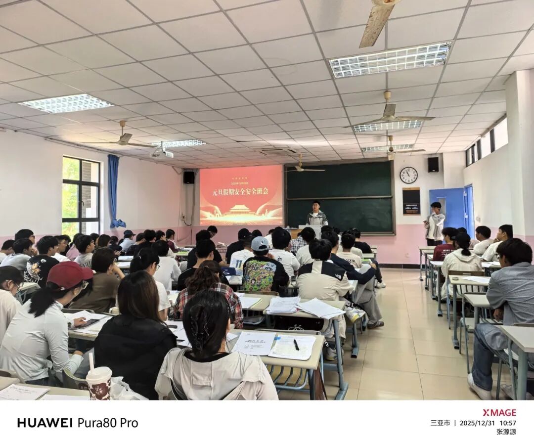 为增强学生安全意识,统筹做好节日保障与学业规划,2025年12月31日,信息与智能工程学院组织各班级开展元旦假期安全教育暨期末复习动员主题班会。本次班会围绕“平安迎新年,安全伴我行;诚信备期末,踏实迎考验”双主题展开,全面强化假期风险防范与期末学风建设。