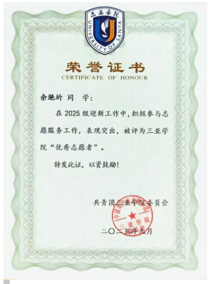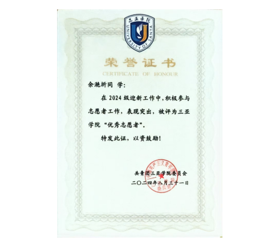 作为中共预备党员,余滟圻始终以高标准践行预备党员的使命。2024年,她积极参与青年大学习等活动,认真学习党的创新理论;日常中主动发挥模范作用,带动同学参与集体实践,最终因“工作努力、表现突出”获评校级“优秀共青团员”。2025年寒假,她参与“把我的大学带回家”寒假社会实践活动,通过线上宣讲、线下分享,向高中母校学弟学妹介绍三亚学院的专业特色与招生政策,用真实经历解答备考与志愿填报疑问。凭借“积极认真”的表现,她斩获“优质高效奖”,在传递大学温度的同时实现了自我价值。