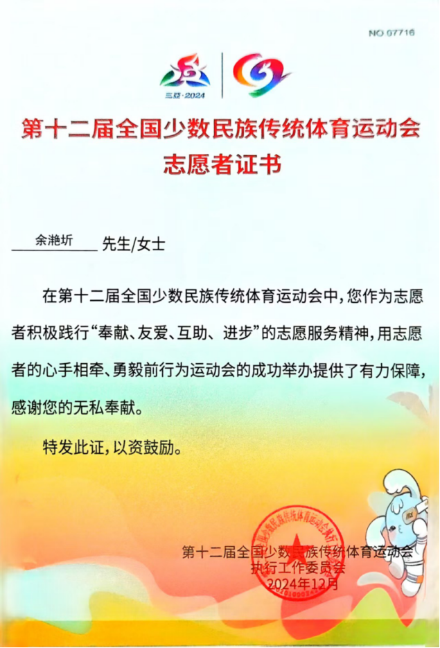2024年12月,余滟圻作为志愿者参与第十二届全国少数民族传统体育运动会,在赛事保障组负责运动员引导与秩序维护。她提前熟悉场馆布局与各民族文化习俗,避免服务禁忌;赛事期间,她坚守岗位,为运动员提供路线指引、物资协助等服务,用细致入微的服务助力赛事顺利举办。她不仅获得志愿者证书,更因“表现突出”获评“优秀志愿者”。同期,她还凭借扎实的英语积累通过全国大学英语六级考试。备考期间,她制定详细计划,强化听力训练、精研阅读技巧,最终以428分的总分(阅读171分)顺利通过,为后续阅读英文专业文献、参与跨语言交流筑牢了基础。