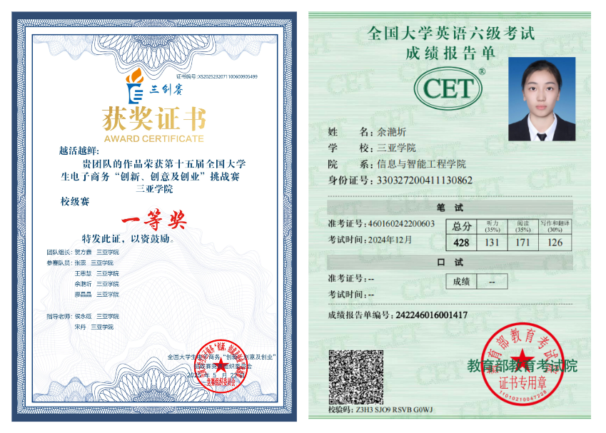 在学科竞赛的赛道上,余滟圻以“敢尝试、肯攻坚”的态度突破自我。2024年,她参与中国大学生计算机设计大赛,负责“蓝疆守望智慧大数据平台”的数据分析模块。从筛选海洋环境公开数据,到清洗冗余信息、构建数据模型,她反复调试算法,解决数据格式不统一的问题,最终协助团队斩获海南省级赛二等奖。同年,她参与中国国际大学生创新大赛校赛,为“海援 - 海上数据瞭望塔”项目设计数据采集框架。尽管仅获优秀奖,但这段经历让她深刻体会到“团队协作”与“技术落地”的重要性,为后续实践积累了宝贵经验。