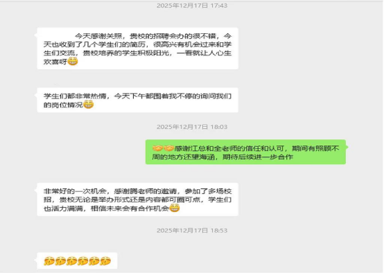未来,双方将以此次交流为契机,持续深化线上线下合作,常态化开展访企拓岗与招聘会对接活动,细化三大专业联合培养方案,推进实训基地建设、师资互聘等工作,以产教深度融合为抓手,助力学生成长成才,为行业发展输送优质技术人才。