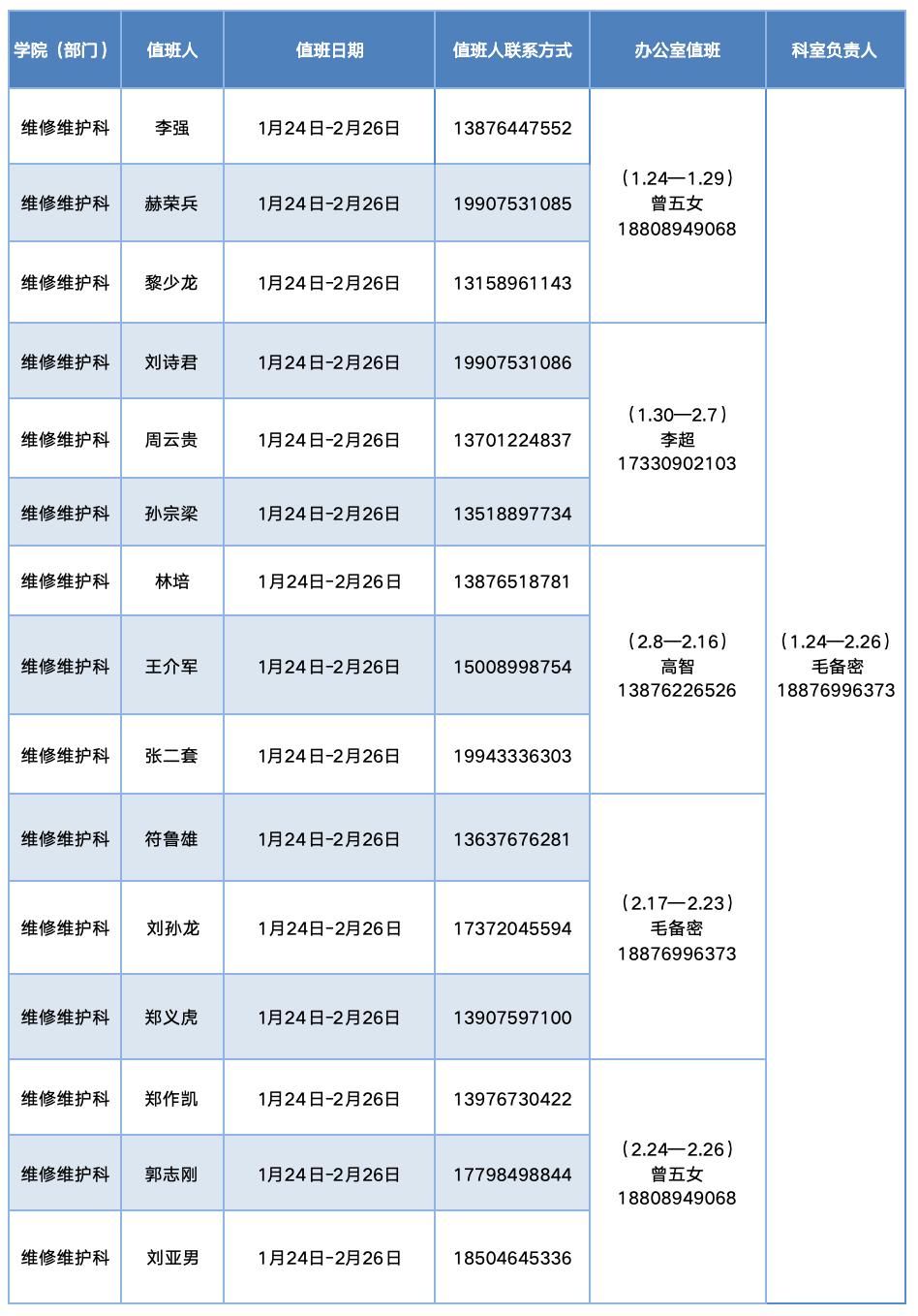 维修维护科2026寒假值班