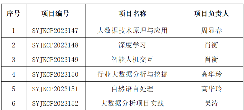 相关课程立项覆盖《大数据技术原理与应用》《深度学习》《智能人机交互》《行业大数据分析与挖掘》《自然语言处理》《大数据分析项目实践》等,分别由周显春、肖衡、高华玲、吴涛等教师负责。
