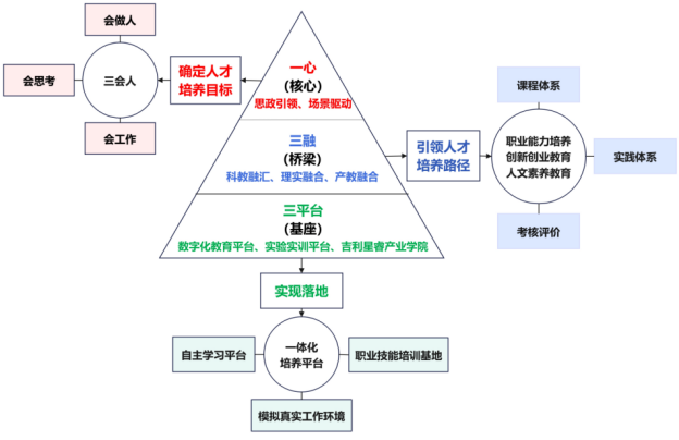 面向新质生产力的人才需求,产业学院在育人模式上形成“一心二融三平台”新路径:以思政引领与场景驱动为核心,以科教融贯与产教融合为双轮驱动,系统构建课程教学、实验实训与产业实践三大支撑平台,贯通育人全过程。