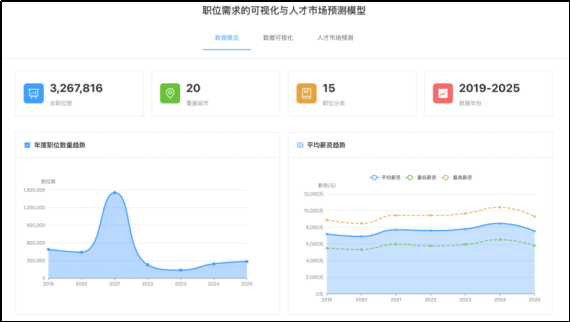 课程后续作业展示中,学生以项目交付为目标,将课堂所学转化为可运行系统:如《职位需求的可视化与人才市场预测模型》基于大规模招聘数据构建数据库与可视化分析,并以Django后端、Vue与ECharts前端完成多维展示与趋势预测。