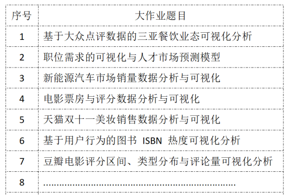 在项目选题与成果呈现方面,课程提供覆盖“行业数据洞察—预测建模—可视化系统实现”的参考题库,引导学生结合兴趣与应用场景自主立题,其中包含“职位需求的可视化与人才市场预测模型”“豆瓣读书结构化数据分析可视化”“智能手机市场销量的数据分析与可视化”等方向。