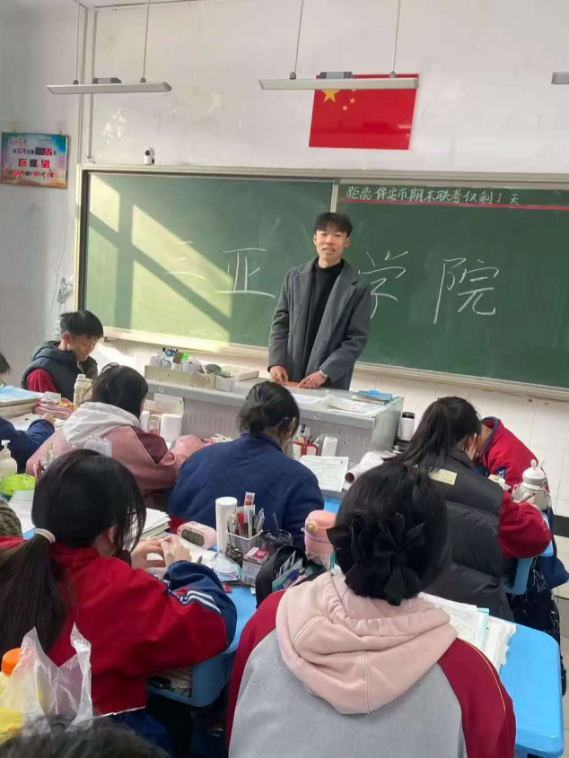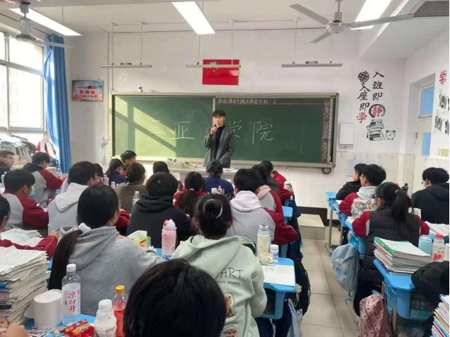 为让家乡高三学子近距离了解母校办学风采,三亚学院信息与智能工程学院智科2301班学子李冰,怀揣对母校的热爱,于2026年1月26日回到河北省保定市河北定兴中学,为高三学弟学妹开展高校宣传宣讲活动。活动前,李冰提前与班主任刘新丽老师沟通对接,精准把握学弟学妹距高考132天、备战保定市期末联考的关键节点,精心整理学校招生政策、专业特色等资料,制作可视化 PPT及宣传手册、明信片,结合备考需求梳理宣讲内容,做好充分筹备。活动现场,他以 PPT讲解的形式,既全方位介绍三亚学院的办学实力、校园生活与智科专业特色,又针对性分享备考时间规划、心态调节和联考冲刺技巧,内容贴合学子核心需求,实用性十足。