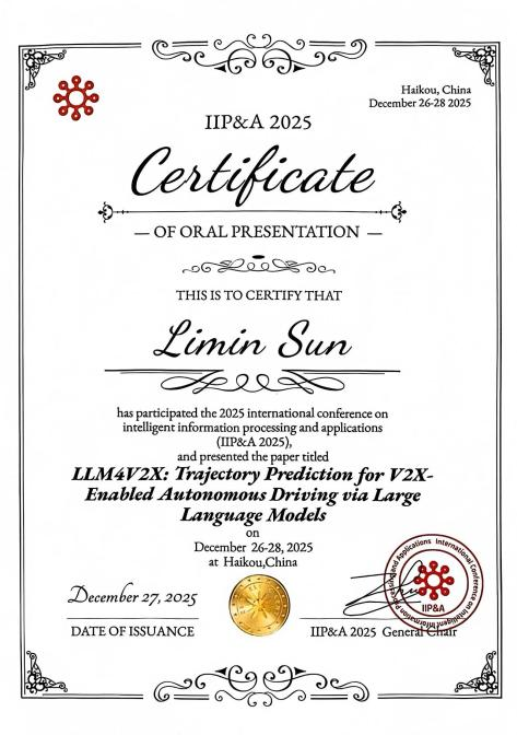 在本次国际会议上,由我院孙立民教授指导、研究生李屹汭共同撰写的论文“车端与车联网数据驱动的LLMs自动驾驶路径规划”成功被会议录用,充分彰显了我院在智能驾驶与智能信息处理交叉领域的科研实力与创新水平。为进一步分享研究成果、促进学术交流,孙立民教授应邀在分组会议上宣读该论文,向与会的专家学者详细介绍了团队的研究思路、核心成果及实践价值,引发了现场参会人员的广泛关注与热烈讨论。