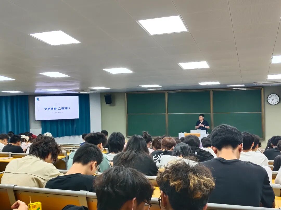 本次研讨会及主题班会紧扣校园文明建设核心要求,将文明规范教育融入学生日常管理全过程,重点围绕遵纪守法、校园行为规范、“四禁”规定等内容开展专题教育。其中主题班会明确强调禁止吸烟、禁止公共场所穿拖鞋、禁止违规养宠物、禁止违规使用及停放电动车等纪律要求,详细讲解了诫勉谈话、全校通报批评、取消评先评优及奖助学金资格等违规处理规定,引导学生知敬畏、守底线、明言行。