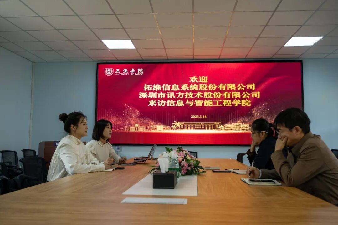 为深化产教融合、拓宽人才培养渠道,3月13日10:30,深圳市讯方技术股份有限公司一行到访三亚学院信息与智能工程学院,深圳市讯方技术股份有限公司广州区域市场总监刘自荣,信息与智能工程学院院长助理刘小飞、系部副主任周显春、闫吉府共同参会,双方在学院会议室就ICT人才培养、专业共建、实训认证等合作事宜展开深入洽谈,携手打造数字人才培养新生态。