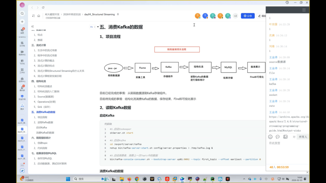 2.实时数据采集:学习了使用 Flume进行数据采集的核心配置。流式数据处理:重点掌握了 Structured Streaming的“流式计算五步法”,实现了对Kafka中实时数据的消费、统计与分析,解决了消息丢失、字段拆分等实战难题。