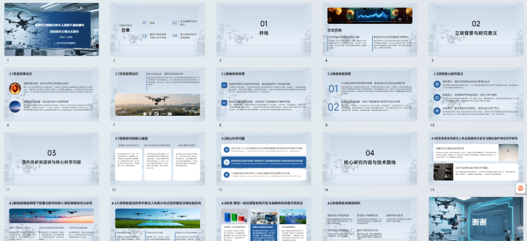 在核心研究内容环节,江荣旺老师详细介绍了项目的四大研究方向与完整技术路线:构建覆盖无人机全攻击面的标准化特征库,设计分级隐私保护特征对齐算法;优化断续弱通信网络下的轻量化联邦协同入侵检测框架;建立入侵感知驱动的多约束分布式协同管控决策机制;开发“边缘端-本地节点-云端监管”三层架构的检测-管控一体化原型系统,并在海南四大核心场景开展实景验证、编制技术规范草案。从数据采集、算法设计到系统开发、场景验证,项目形成了环环相扣的技术路线闭环,兼具理论创新性与实际应用价值。