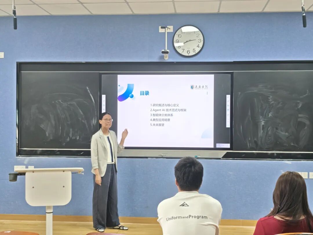 讲座中,杨婷婷教授围绕Agent AI核心技术,深入解读多模态融合与具身智能的发展历程、技术原理及应用前景。她系统阐释了AI从单一感知向多模态协同、从被动响应向自主行动的发展路径,结合行业前沿案例,剖析了多模态融合技术的关键突破,以及具身智能在智能机器人、智慧服务、智能制造等领域的实践应用,为师生带来了专业且前沿的技术分享。