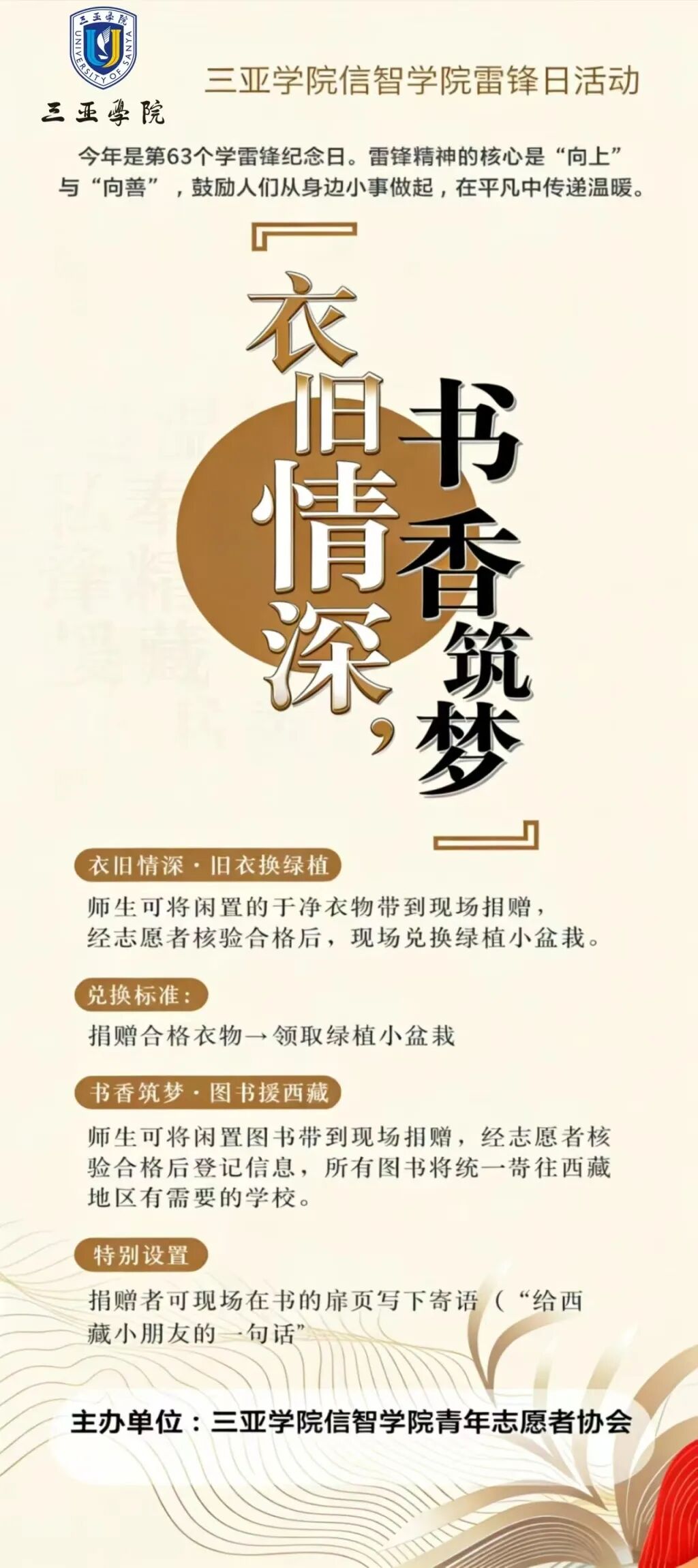 今年是第63个学雷锋纪念日,为弘扬“向上向善”的雷锋精神,践行志愿服务理念,信息与智能工程学院青年志愿者协会将于本周四举办公益捐赠活动。具体安排如下:
