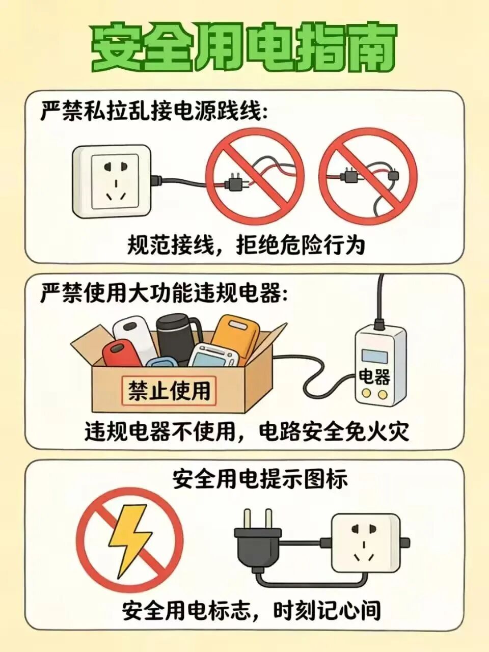 1.严格遵守宿舍管理规定:不留宿异性及外来人员,时刻注意身边的安全隐患。 2.禁用违规电器:严禁在宿舍使用“热得快”、电煮锅、电暖器等大功率违规电器,不私拉乱接电线。 3.牢记宿舍断电:离开宿舍时,务必关闭所有电源、灯源,拔掉充电器、插排插头。严禁在宿舍内吸烟、使用明火,不焚烧物品。 4.做好防盗措施:关好宿舍门窗、锁好柜门,笔记本电脑、相机、现金等贵重物品随身携带或妥善寄存。