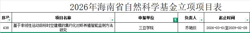 信息与智能工程学院教师乔艳琰老师主持申报的“基于非线性运动目标时空建模的集约化对虾养殖智能监测方法研究”课题,成功获批为2026年海南省自然科学基金青年基金项目。该课题提出一种在实际场景中无接触式检测虾体视觉属性特征并进行智能化资源量统计的方法,核心目标是大幅提升对虾健康状况检测与资源量评估的准确性、高效性,为对虾养殖精细化管理提供科学技术支撑。